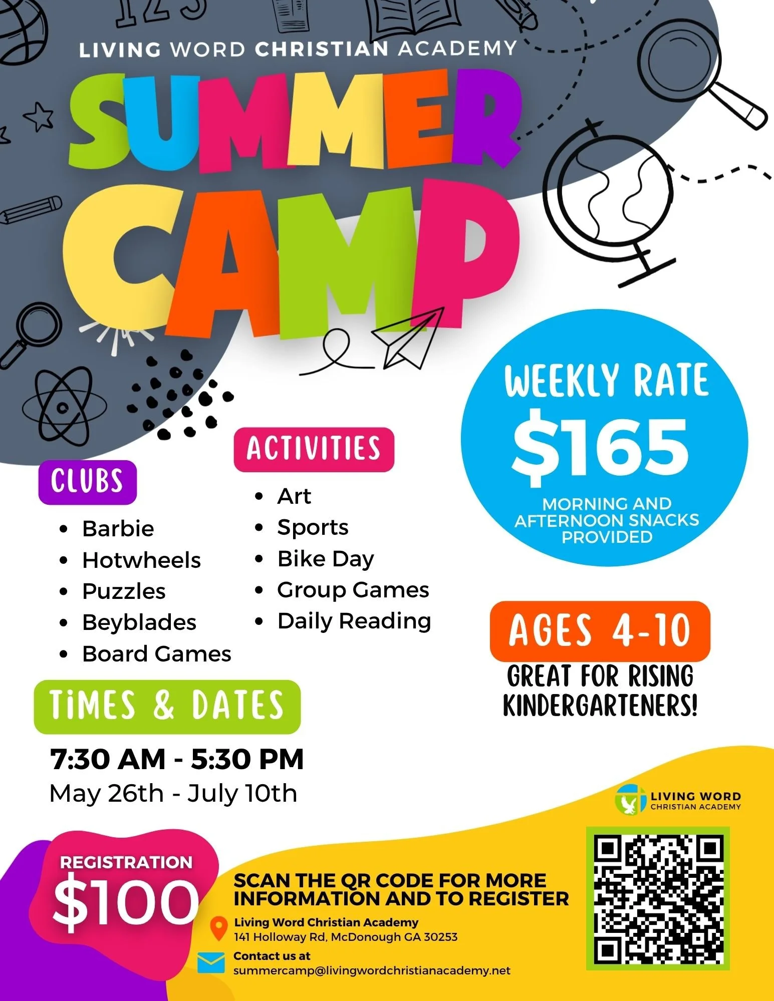 LATE FEE: If tuition is not paid by Monday at closing time, a $10 late fee will be charged to your account Tuesday, and $5 per day until paid. Children with a past due balance will not be allowed to attend the following Monday unless the past due balance is paid in full. No account will be held for more than one week. We do not carry balances. If for any reason you decide to withdraw your child from Living Word Christian Academy Summer Camp, a two week notice is required.